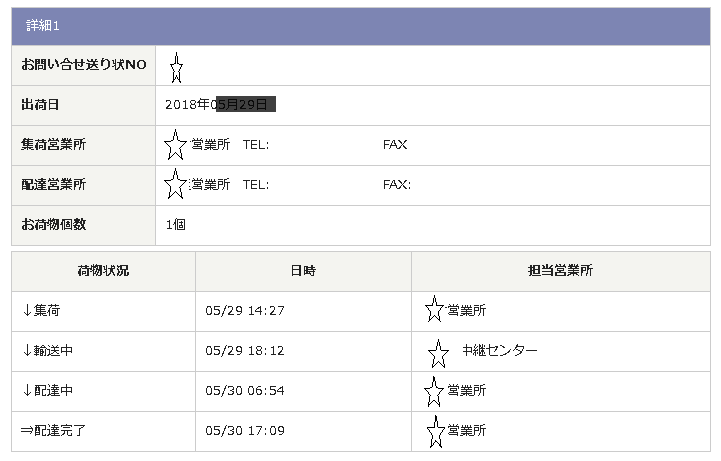 日時は受け取った日時、担当営業所は荷物を預かった営業所の名前ということになります。
