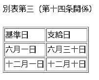 第十四条 期末手当及び勤勉手当の支給日は、別表第三の基準日欄に掲げる基準日の別に応じて、それぞれ支給日欄に定める日とする。ただし、支給日欄に定める日が日曜日に当たるときは同欄に定める日の前々日とし、同欄に定める日が土曜日に当たるときは同欄に定める日の前日とする。