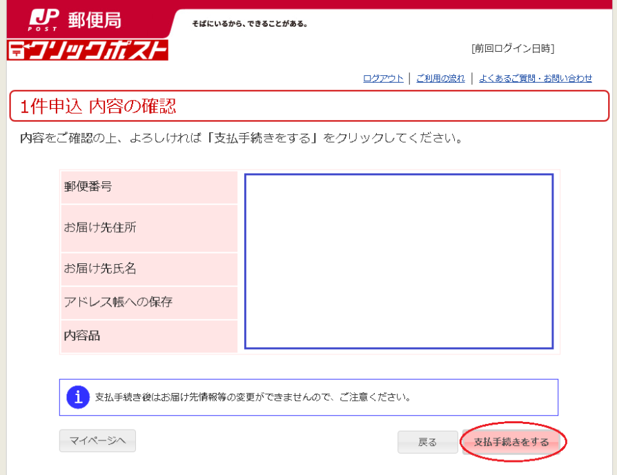 ④青枠の中に自分が入力した内容が出るので、確認して「支払手続きをする」をクリック。