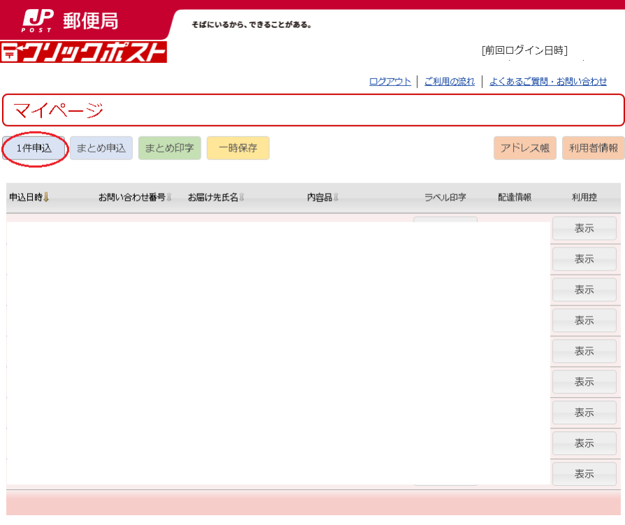 ②マイページの「1件申込」をクリック(たくさんある場合はまとめて申し込みもできます)