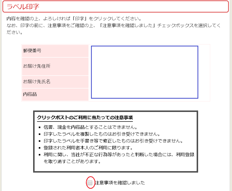 ⑥青枠内の内容を確認しチェックをして、「印字」をクリック