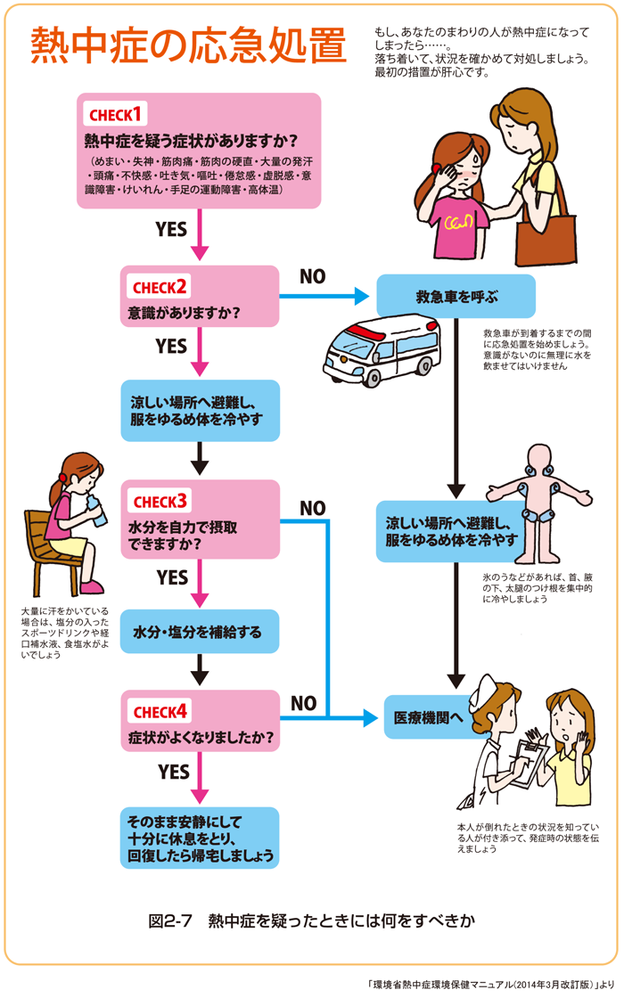 こちらは、熱中症の応急処置の方法がイラストで分かりやすく説明されていますので、参考にしてください。